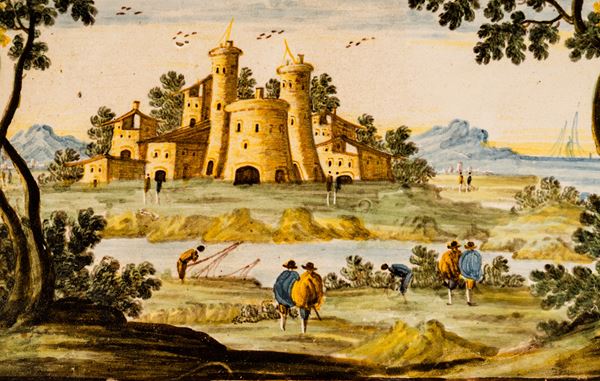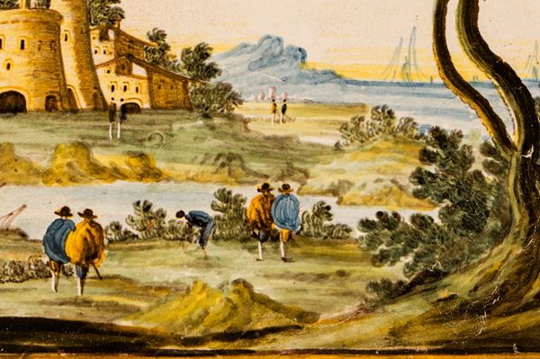 Mattonella con decoro ad ornato a paese e viandanti. Cornice dorata