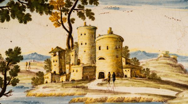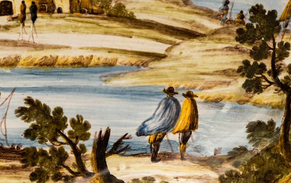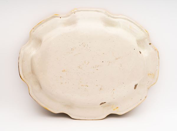Vassoio ovale a bordo mistilineo con decoro ad ornato a paese e animato da figure di viandanti