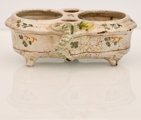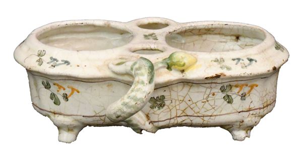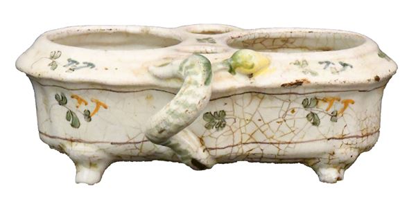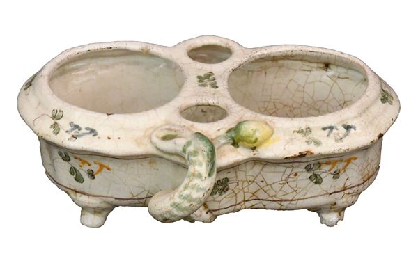 Oliera-saliera in maiolica decorata con delicati motivi floreali. Presa a serto fiorito. Manifattura di Cerreto Sannita, metà del XVIII secol [..]