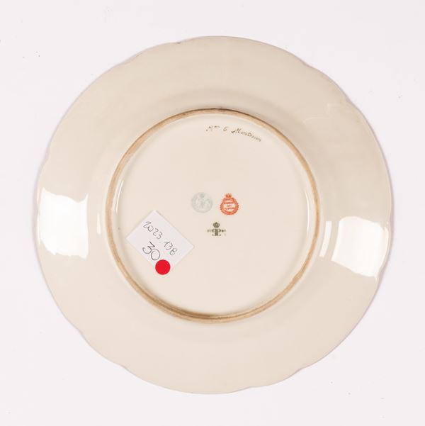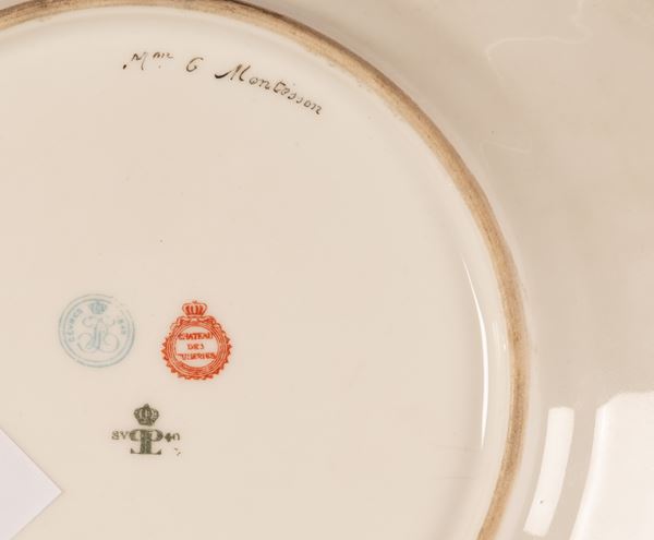 Piattino in porcellana con decoro nello stile Sevres del XVIII secolo in verde e oro e ghirlande floreali sulla tesa. Manifattura M. Montoscoli, [..]