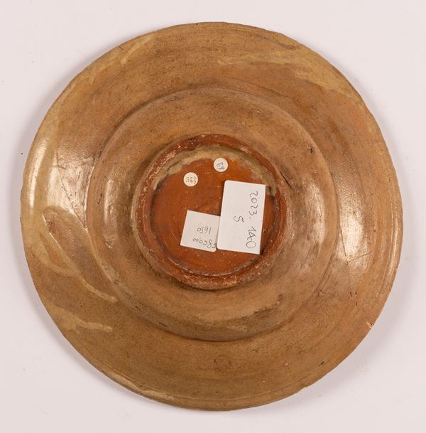 Ø cm 28alla tesa in giallo con quattro fiori blu stilizzati ai punti cardinali; cavetto decorato a motivo araldico con aste che si incrociano terminanti con decoro stilizzato a giglio.