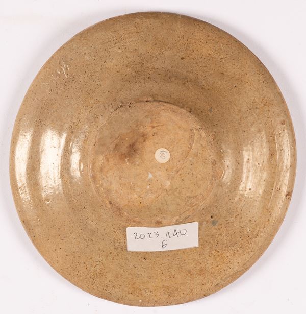 Piatto decorato alla tesa con motivi geometrici ed ondulati in blu e manganese. Al cavetto decoro con fiore stilizzato ad otto punte. Manifattura [..]