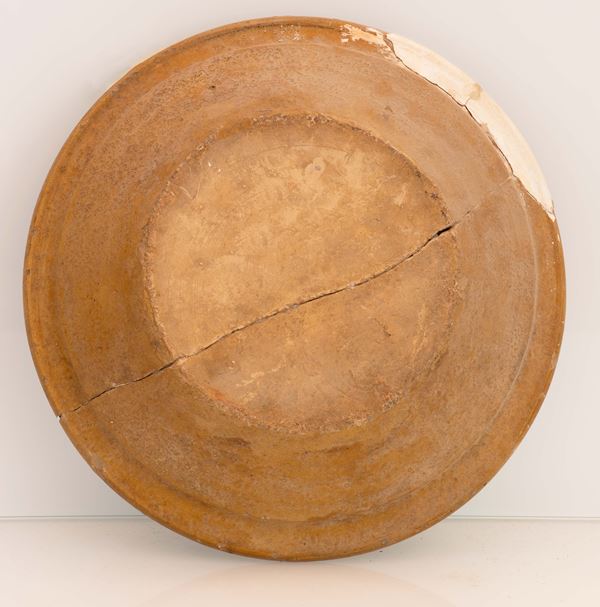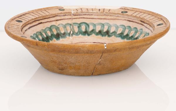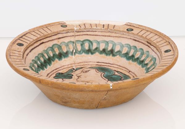 Piatto in ceramica ingobbiata graffita ed invetriata con motivi decorativi in verde ramina ad archetti e geometrici nella tesa e nel cavo ritratto [..]