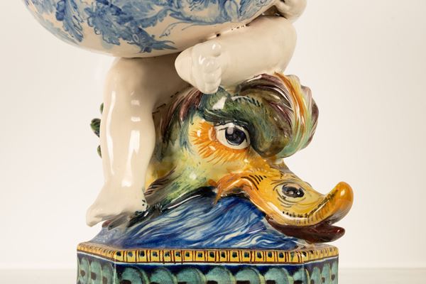 Soprammobile in maiolica portafiori con putto bianco modellato a tutto tondo. Manifattura Cantagalli, XX secolo