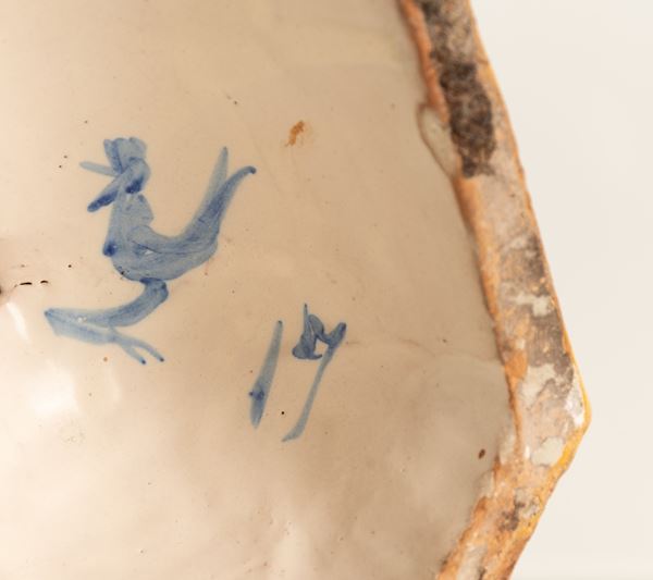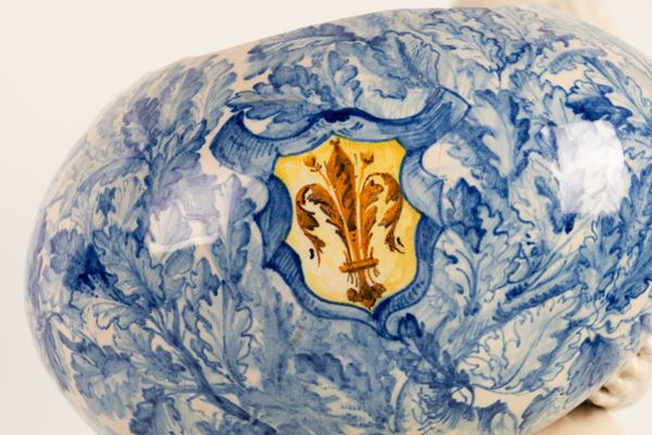 La figura, assisa su un animale marino, stante a trattenere un uovo aperto nella parte superiore decorato con foglie di quercia blu e centrato in riserva giallo da un giglio di Firenze in manganese.