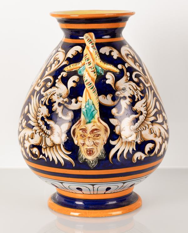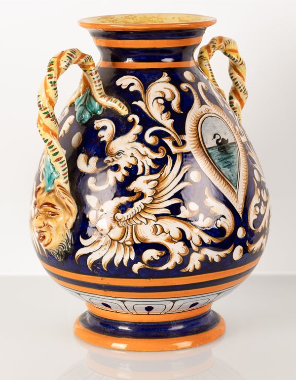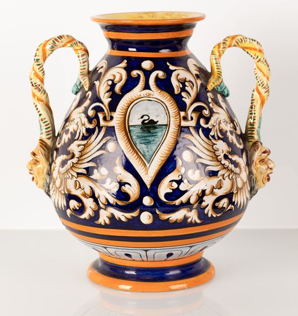 Vaso in maiolica biansato con anse ritorte terminanti a mascheroni antroomorfi. Manifattura Egisto Fantechi, inizi del XX secolo.