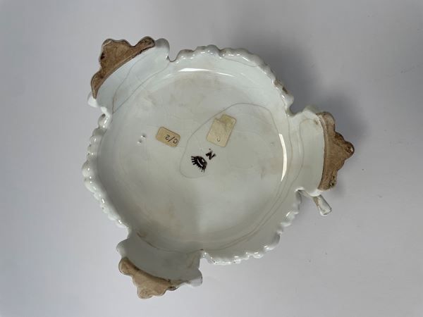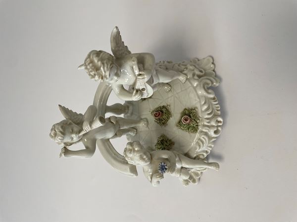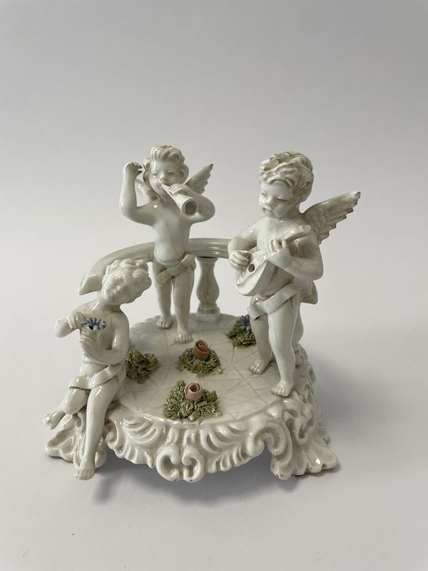 Composizione in porcellana bianca con inserti policromi di fiori raffigurante tre putti che suonano, uno la tromba, l'altro il mandolo e uno [..]