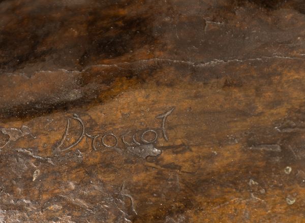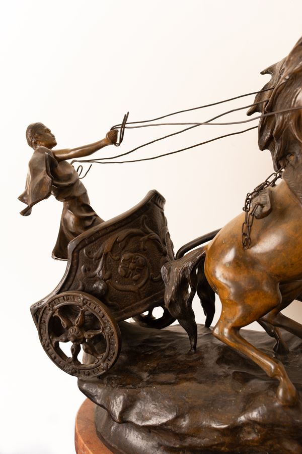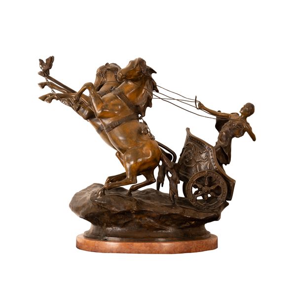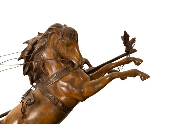 Biga classica in bronzo con cavalli rampanti su base rocciosa.