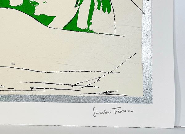 Serigrafia materica con con applicazione di carta velina e foglio argento realizzata a mano.