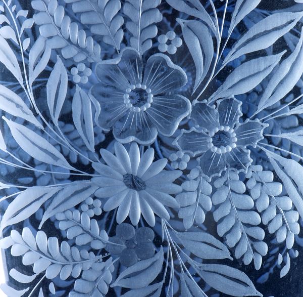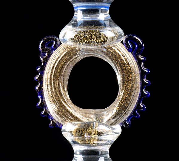 cm 47x20x14Riccamente incisa a motivi floreali. Un decoro a anello dorato con inserti in vetro nero di Murano separa il calice dalla base.