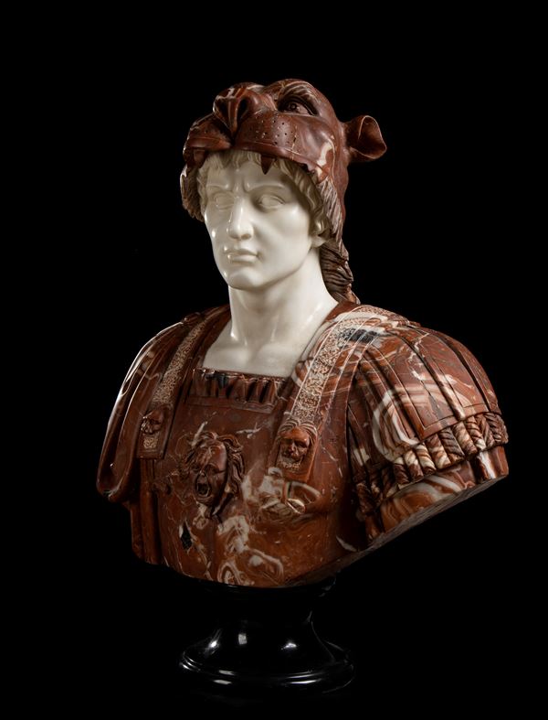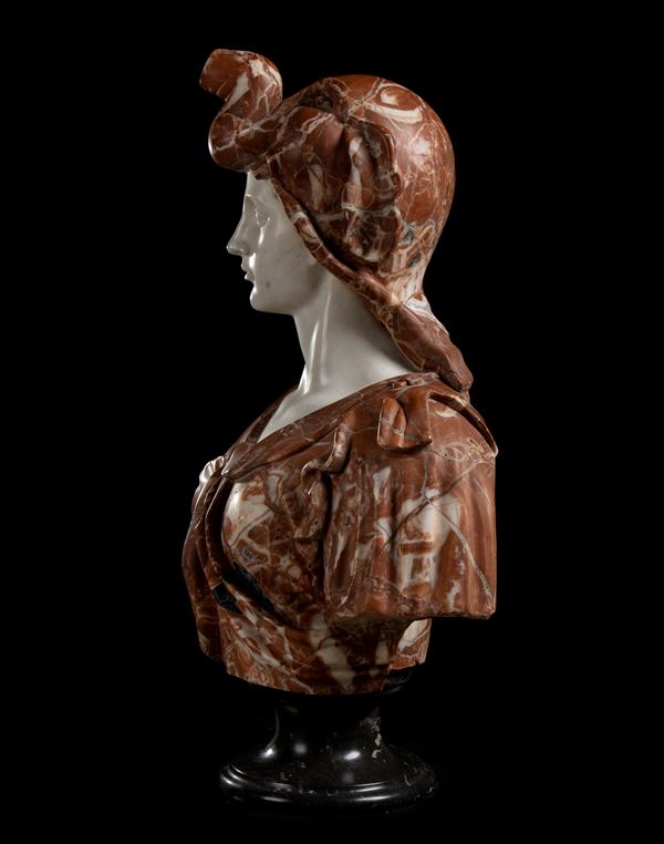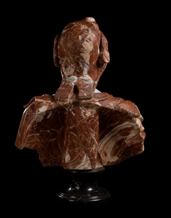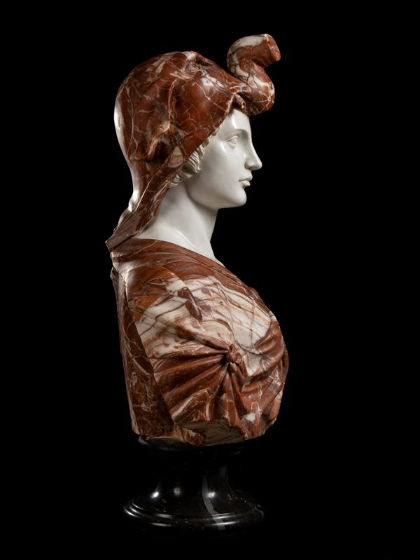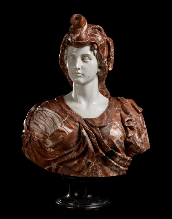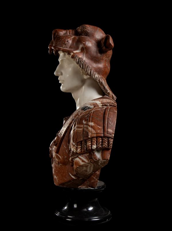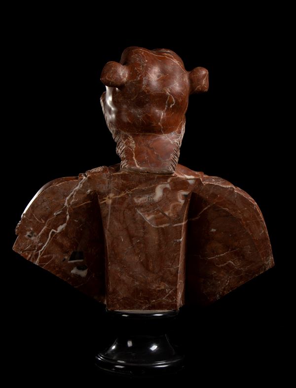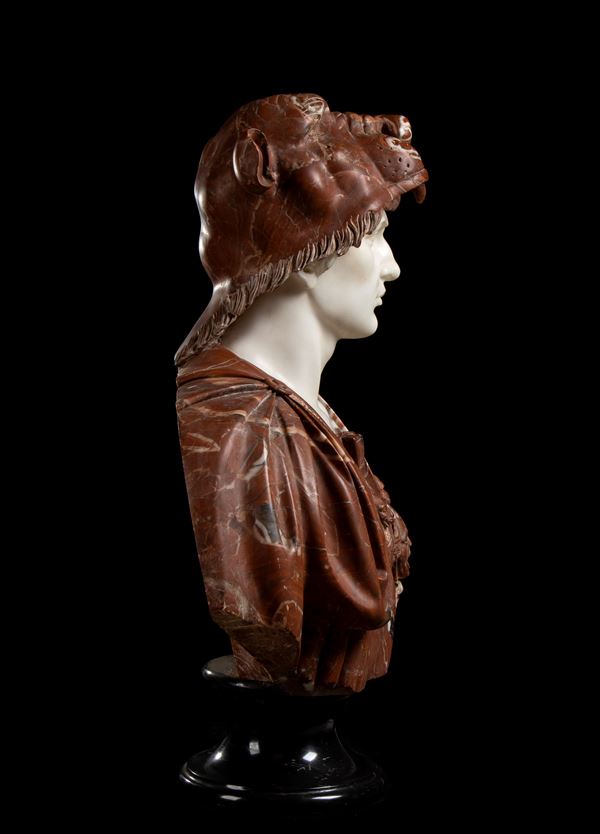 Coppia di busti in marmo rosso Asia Minore raffiguranti Alessandro Magno con copricapo di testa di leone e una donna con testa di elefante