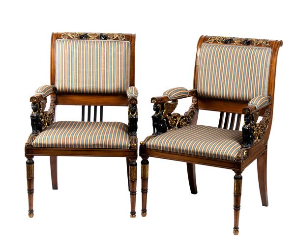 Braccioli impreziositi da terminali a piccole sfingi in legno smaltato nero e dorato con ricche volute vegetali e floreali.