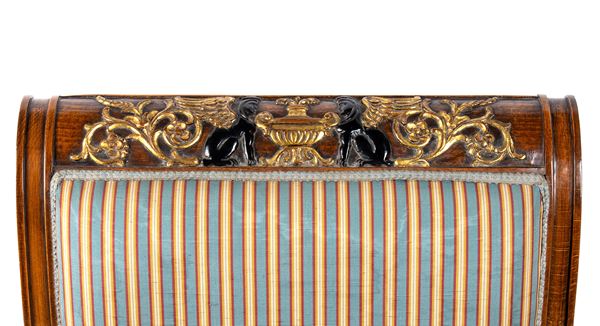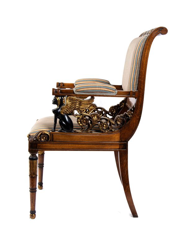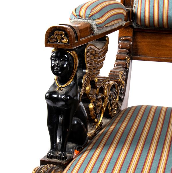 cm 96x49x58Schienale terminante con decorazione a rilievo con cratere a guisa di fontana e due sfingi in legno smaltato nero.