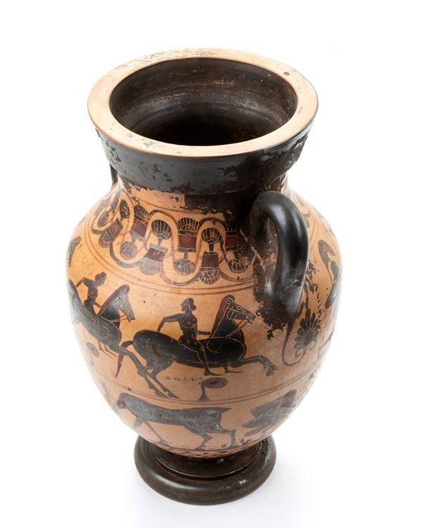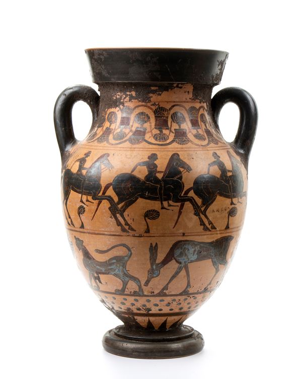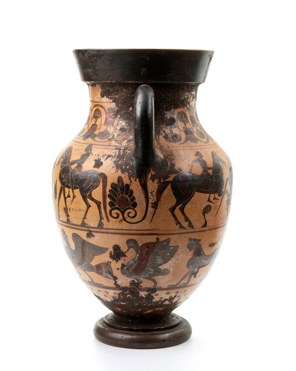 Grande anfora biansata in ceramica arcaica a figure nere con animali, guerrieri e decorazioni su tre registri