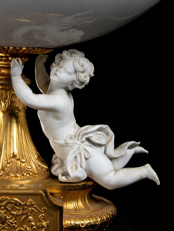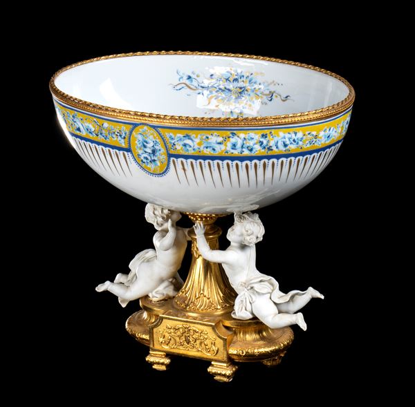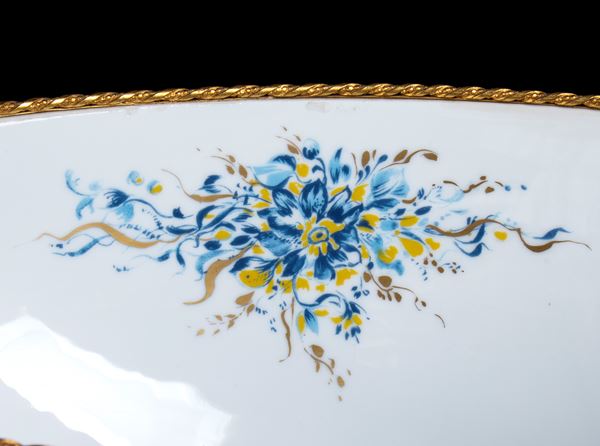 Grande Centrotavola ovale di porcellana marcato Decortiche (Tiche Porcellane d'Arte) "Paradiso" con bordo fiorato e dorato e base in metallo [..]