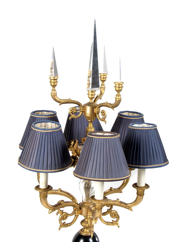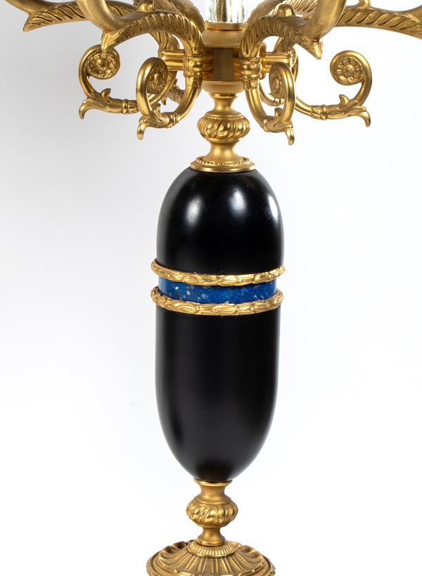 Importante coppia di grandi lampade da tavolo in stile Impero con corpo in ottone dorato e legno ebanizzato.