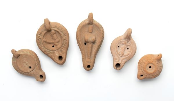 Lotto di 5 lucerne in terracotta con decori a rilievo con Ape, Cibele Siriaca, un priapo, ancora con delfino