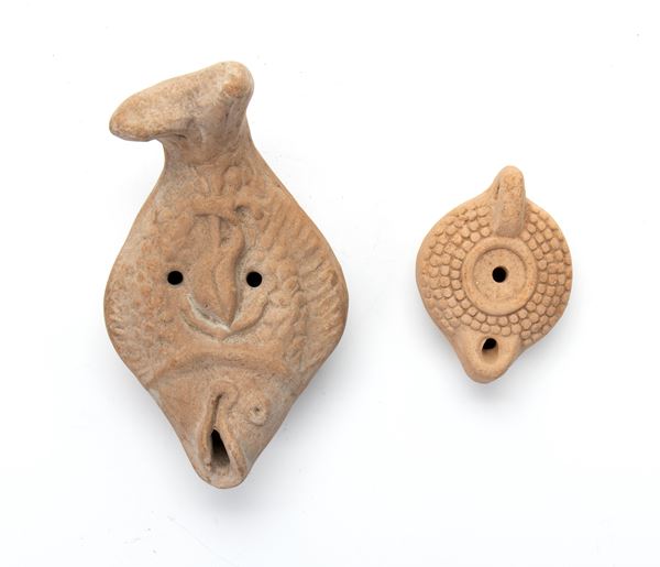 Lotto di due lucerne in terracotta, una a forma di pesce con ancora e defino a rilievo, l'altra con decoro a rilievo a rete