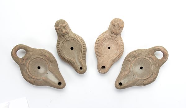 Lotto di quattro lucerne in terracotta, due con mascherone e 2 con pesci a rilievo