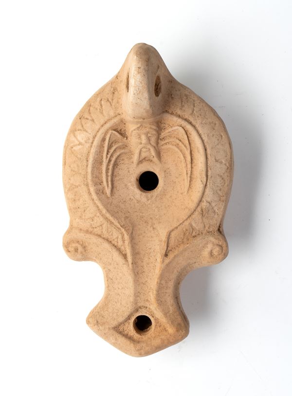 Lucerna in terracotta con decoro a rilievo di vecchio barbuto