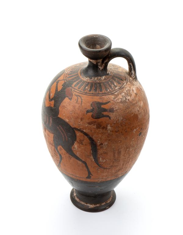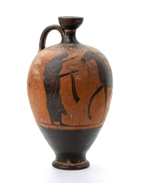 Oinochoe in ceramica a figure nere con commiato ad un guerriero a cavallo