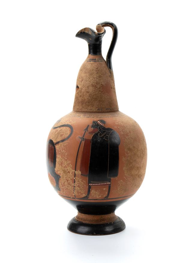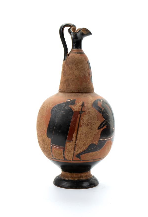 Oinochoe in ceramica arcaica a figure nere con teoria di guerrieri
