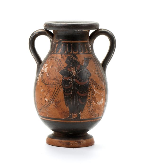 Piccola anfora in ceramica arcaica a figure nere con figura femminile seduta con tridente e al retro figura togata con cornucopia