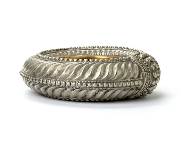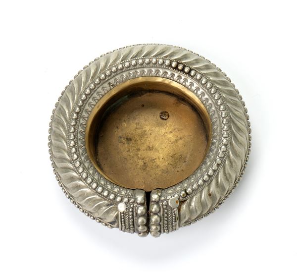 Posacenere in metallo dorato e argentato con ricco decoro a rilievo