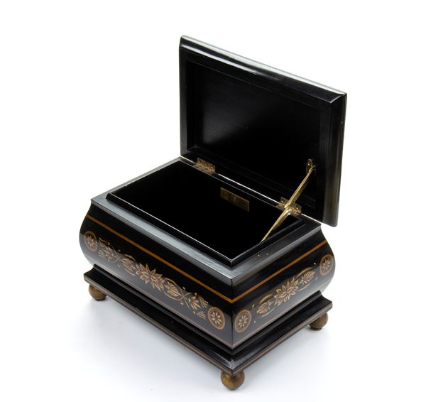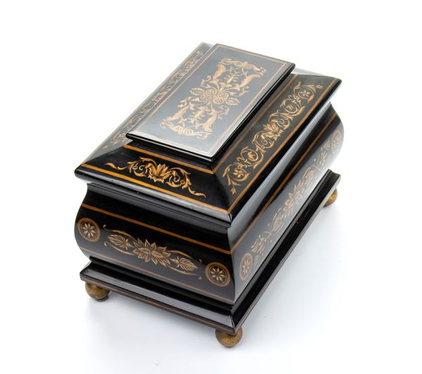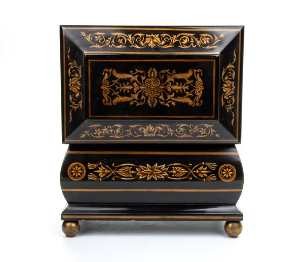 Scatola portagioie ad urna in legno laccato e dipinto con decori fitomori e geometrici Maitland-Smith
