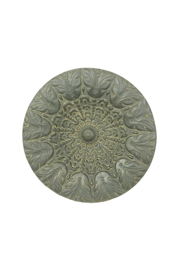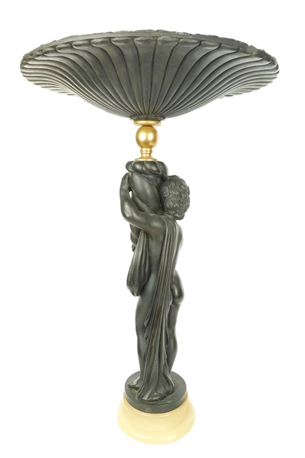 Scultura in resina raffigurante putto che regge una cornucopia terminante in cratere circolare riccamente cesellato all'interno. Inserti in [..]