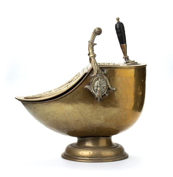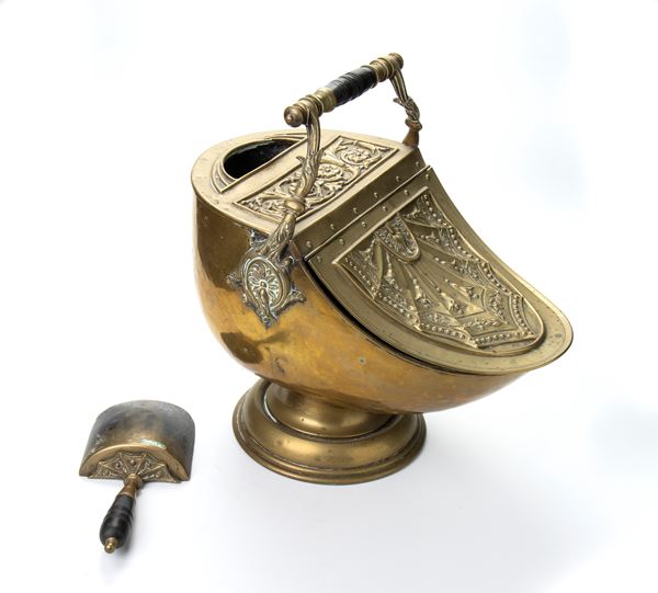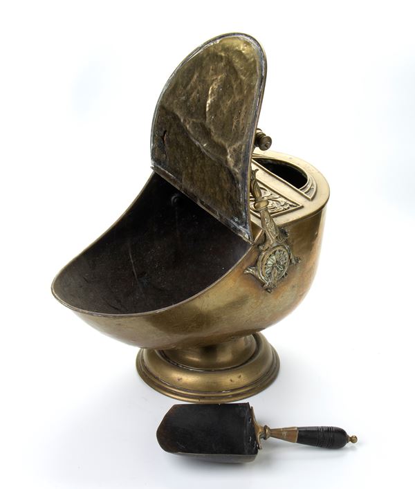 Tazza da carbonr art nouveau in ghisa e ottone a forma di elmo con decorazione a rilievo e manico e pala in legno tornito.