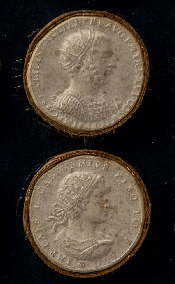 Teca in perspex laccato nero e trasparente conteneenti riproduzioni di antiche monete romane in gesso