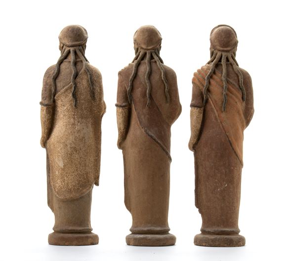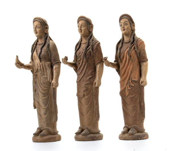 Tre figure femminili in terracotta in stile etrusco una reggente un fiore, una un vaso e una una colomba