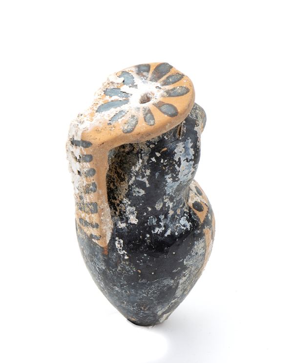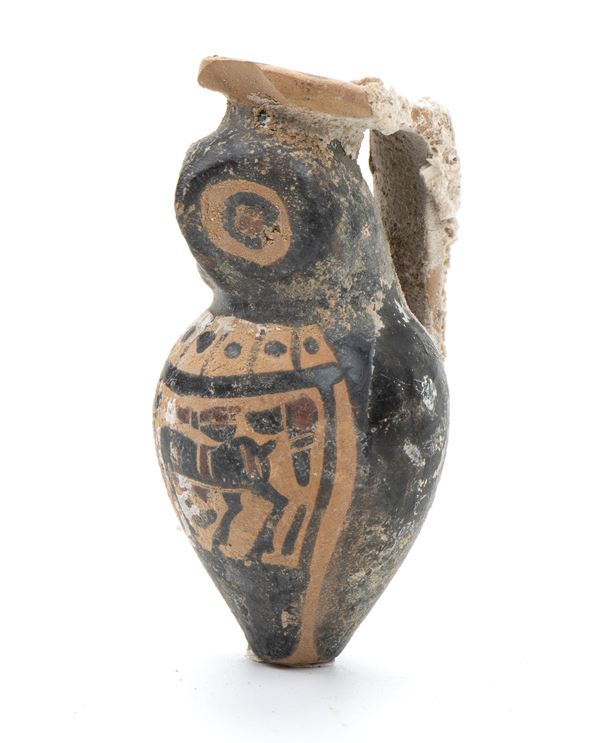 Vasetto portanguenti in ceramica arcaica a figure nere modellato a guisa di civetta
