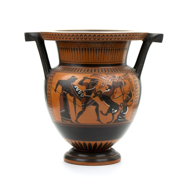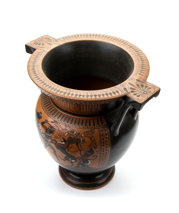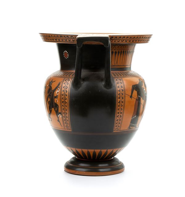 Vaso a cratere biansato in ceramica attica arcaica a figure nere decorato con scena di thiasos bacchico