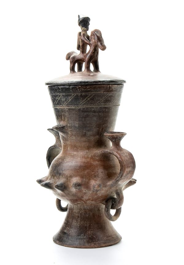 Vaso biconico sannita in ceramica buccheroide con decoro zoomorgo sul coperchio e umboni con anelli nella parte bassa