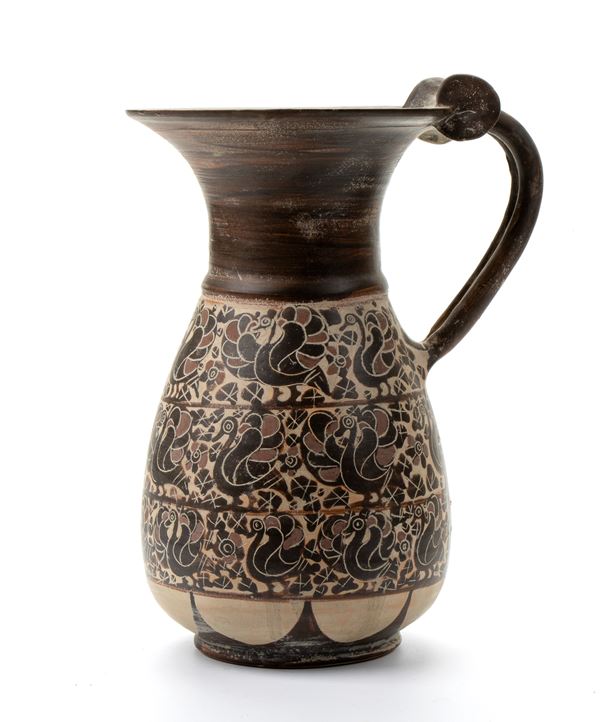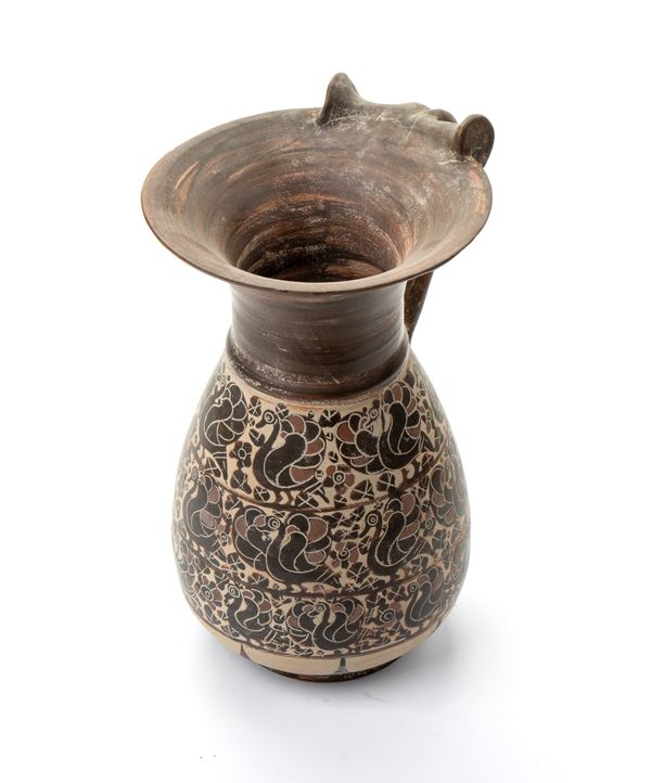 Versatoio monoansato in ceramica arcaica a figure nere rappresentante uccelli