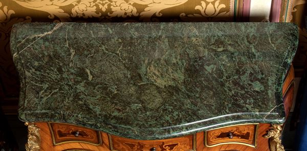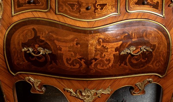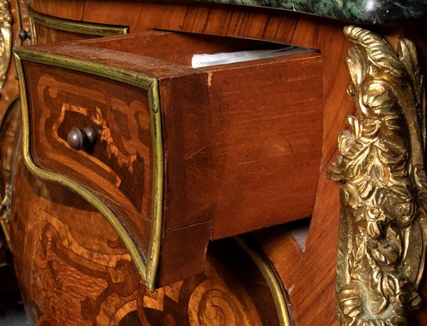 Comodino con ampio cassetto tre cassettini al fronte decorato con inserti in ottone dorato e lastronature a motivi vegetali