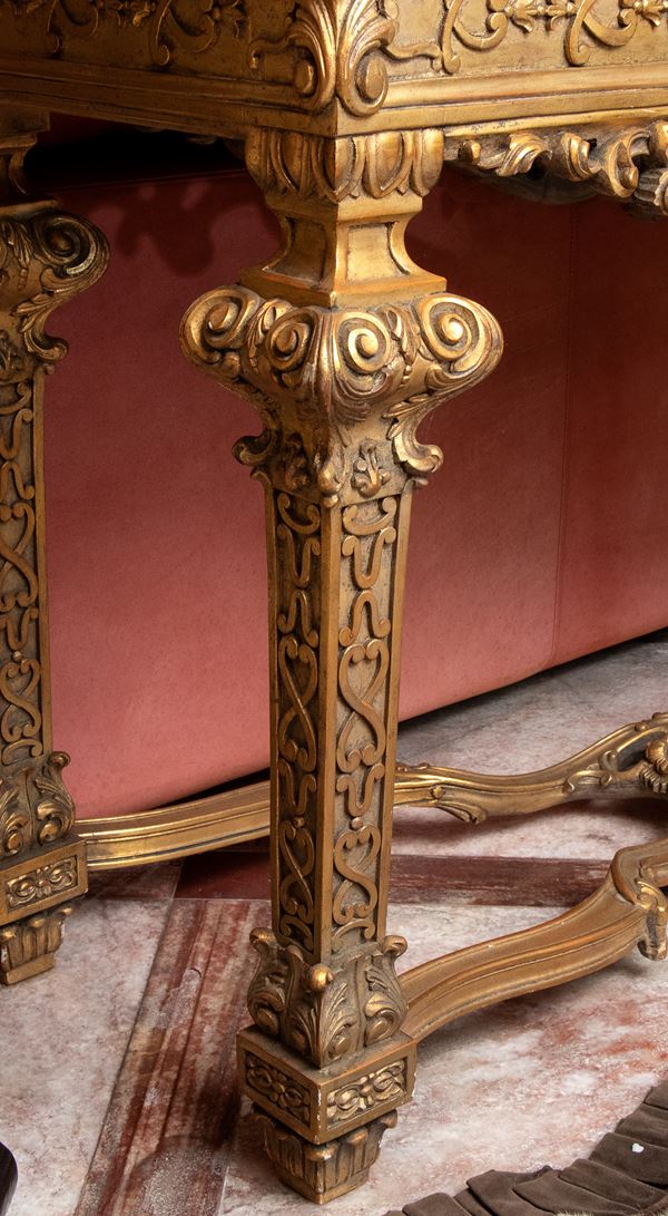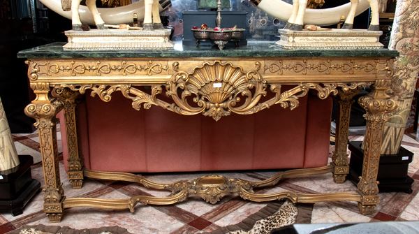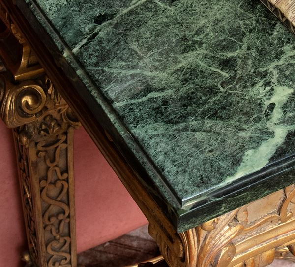 Consolle da centro in legno dorato e scolpito con piano in marmo verde Guatemala e specchiera