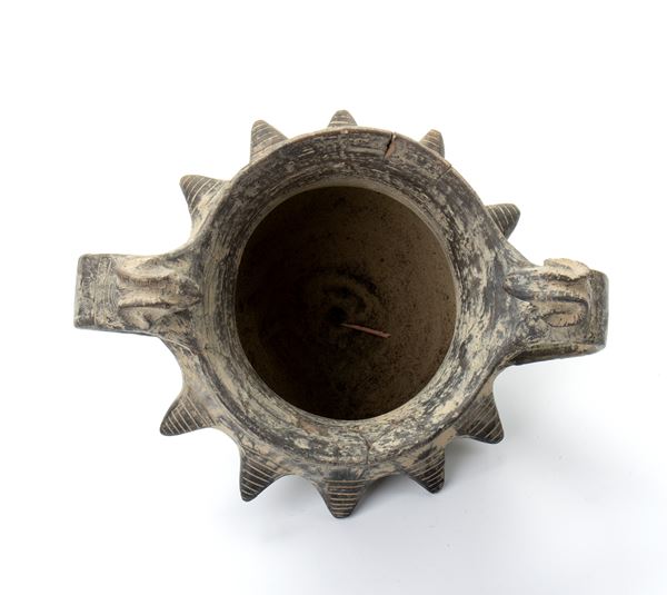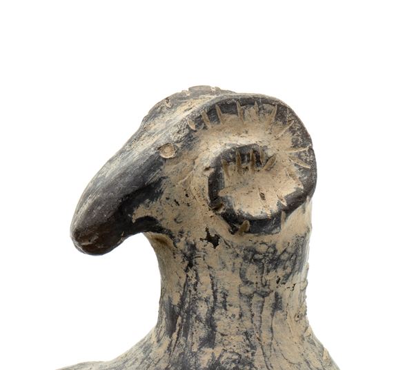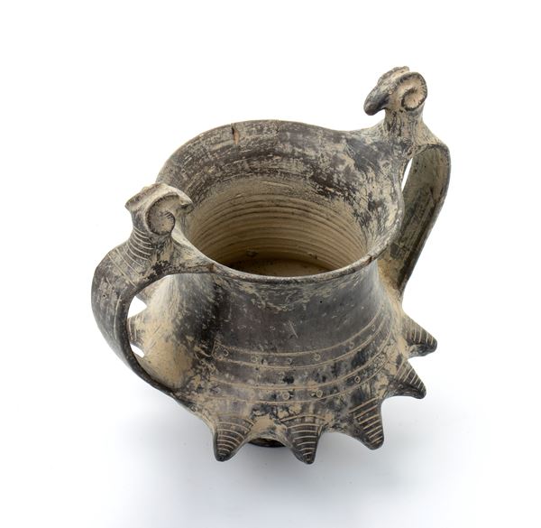 Coppa biansata in ceramica buccheroide con decori a rilievo di testa di montone sulle anse e umbonati sul corpo