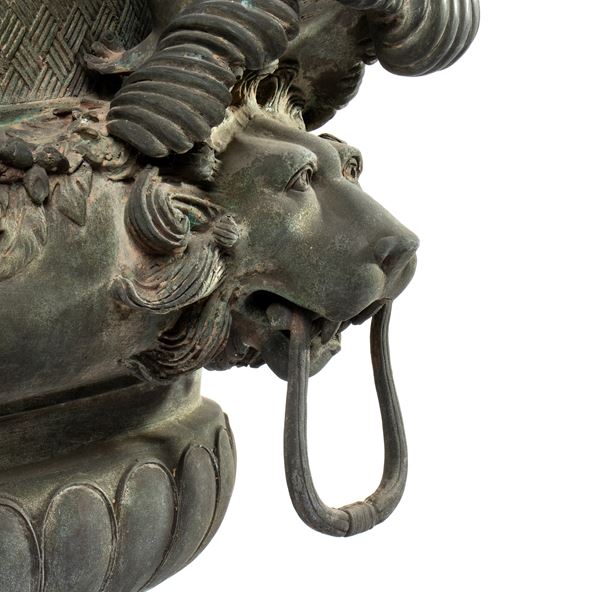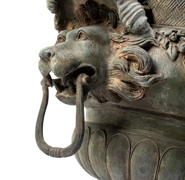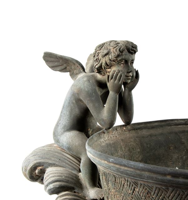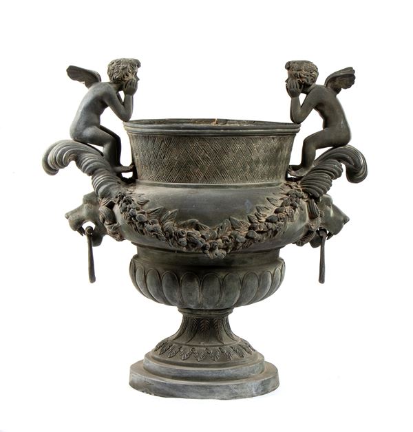 Coppia di grandi vasi bronzei con manici a guisa di leone sormontati da foglie di acanto e putti intenti a poggiare la testa sulle mani, raccordati [..]
