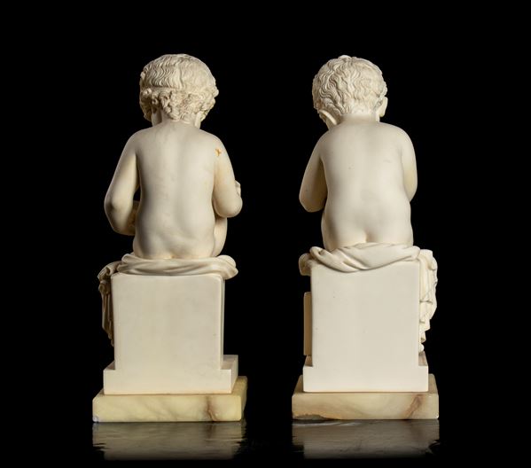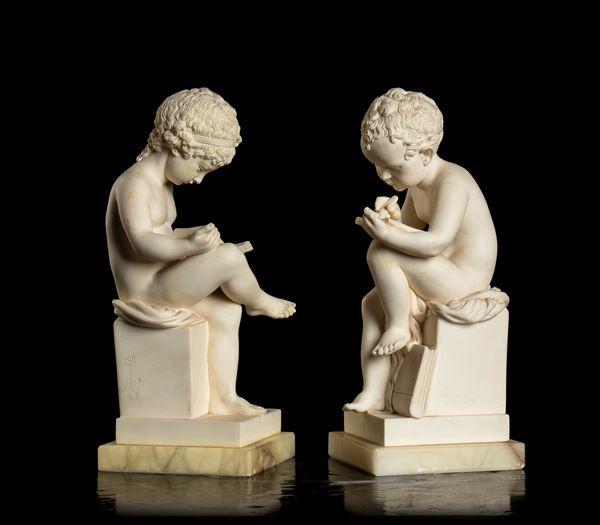Coppia di piccole sculture in resina raffiguranti un putto che legge e un putto che scrive