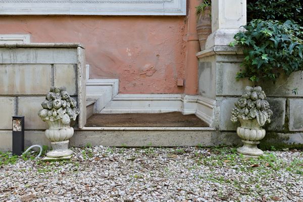 Coppia di vasi da giardino in pietra ricolmi di fiori e frutti