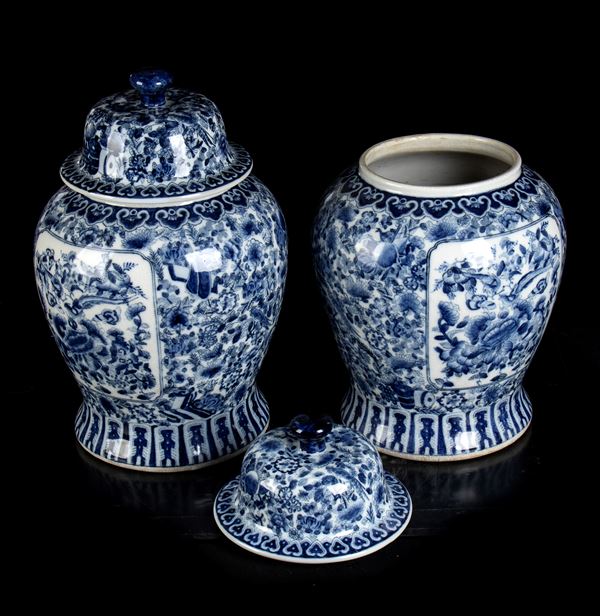 Coppia di vasi da tempio in porcellana blu e bianca con motivi arabescati e floreali