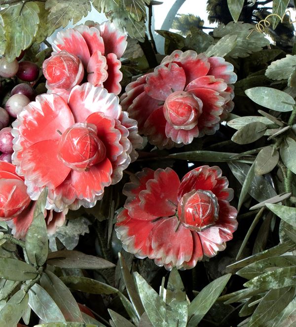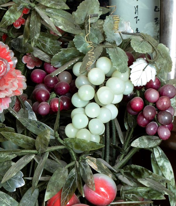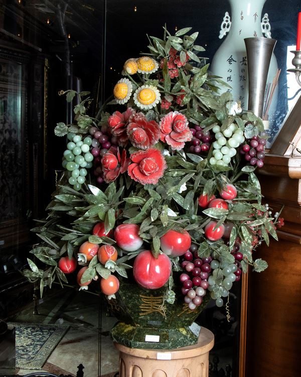 Coppia di vasi in giada e giadeite raffiguranti cesti di fiori e frutta con basi in marmo con iscrizioni orientali