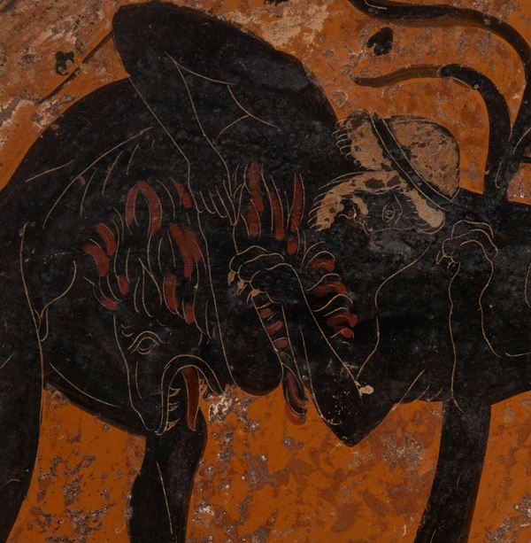 Disco in ceramica arcaica a figure nere raffigurante una delle fatiche di Ercole, ovvero la Vittoria sul Leone di Nemea