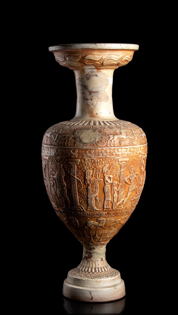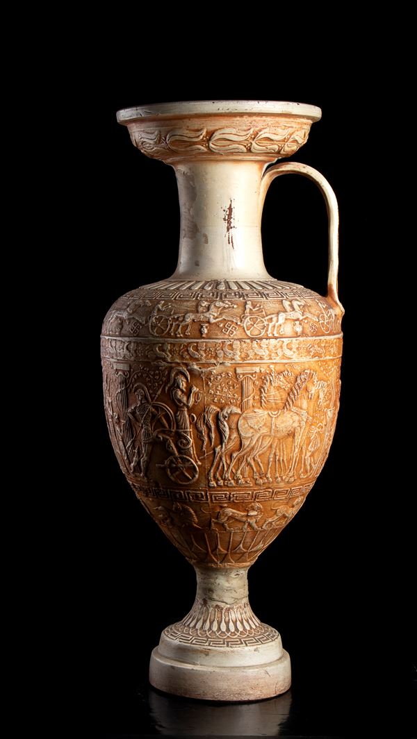 Grande anfora monoansata ad imitazione del marmo con ricchi decori a rilievo di carri trainati da cavalli