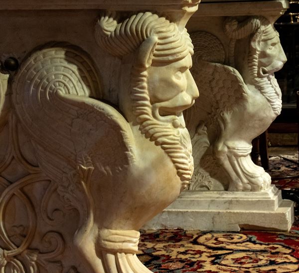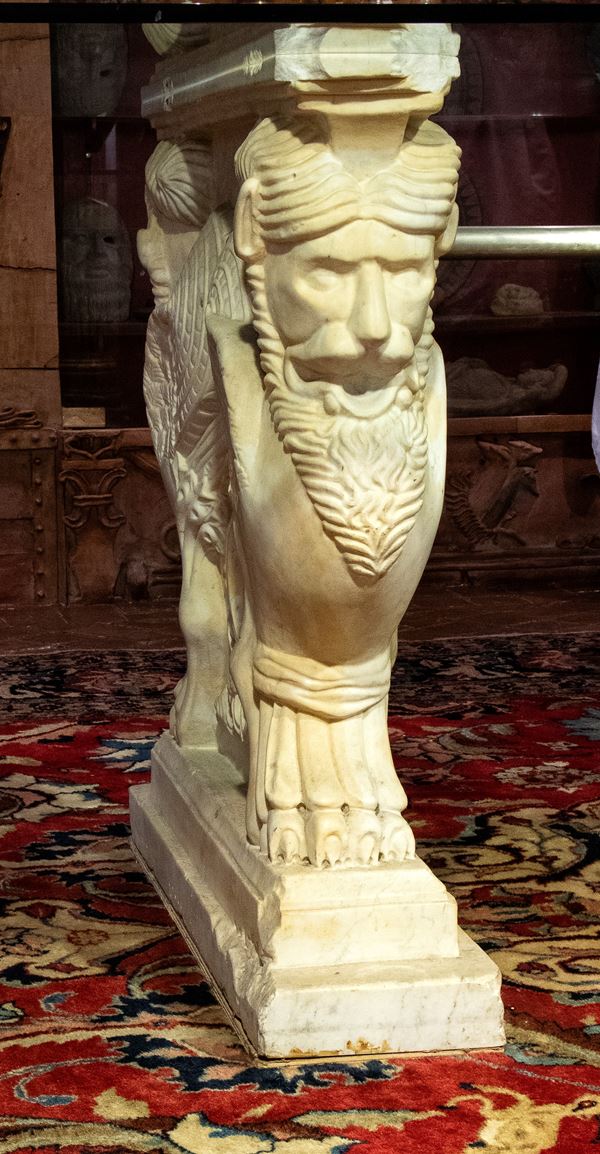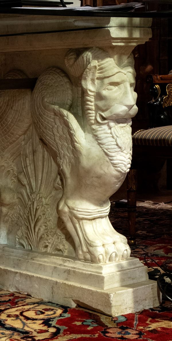 Grande tavolo con piano in cristallo e base in marmo intagliato con fiere alate bifronti