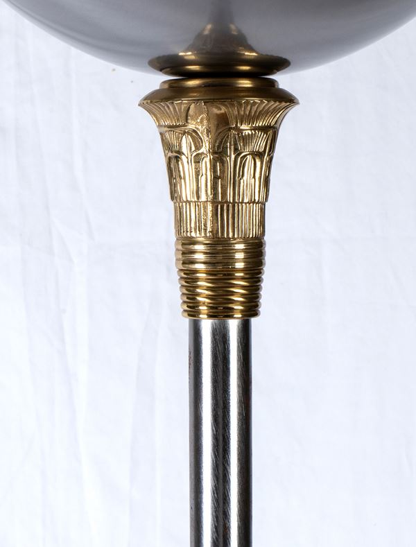 Lampada da terra in metallo argentato e dorato in stile Impero con base tonda.