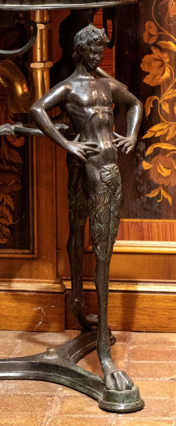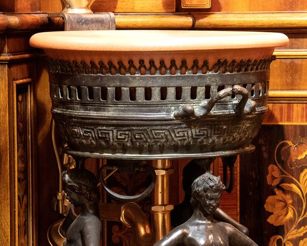 Lavandino montato a tripode bronzeo con vasca. Gambe con grandi figure terminanti con piede ferino